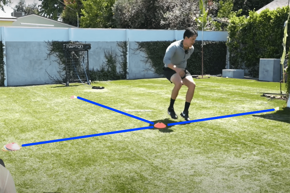 The drill we’re going to do is called the L drill. You’ll set up two cones, each 5 yards apart. You start by running to the first cone, touching it, then running back. Next, you run to the second cone, go around it, and finish by running back to the starting point.